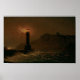 A great lighthouse burns fiercely against the dark of night, flames leaping into the sky and reflecting off the water below. Boats rush towards the blaze as figures on the shore watch in horror and awe. Smoke curls across the stars, and the ocean glows with the eerie light of disaster.