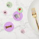 Decorate your party table with this cute English Bull Terrier table confetti. This confetti is shown in pink, purple and green pastel colours. Each size has a cute English Bull Terrier on it and the other side of each size features either a black paw print, a red heart, or a brown bone.