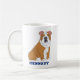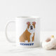 Create a personalised gift that's perfect for dog lovers and dog owners. This coffee mug features a realistic style illustration of an English bulldog in light brown and white. Below the graphic is a spot to add a name in bold navy blue lettering. The illustration and the text appear on both sides of the mug.