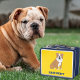 Add a name to this lunchbox to create the perfect accessory for owner of pet bulldogs. The front of this lunchbox features a realistic style illustration of an English bulldog in light brown and white set against a bright yellow background and is ready to be personalised with a name in bold navy blue coloured lettering. The reverse side has a coordinating striped pattern.