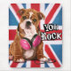 Funky english bulldog puppy with Union Jack in the background, painted by artist Maryline Cazenave.