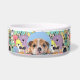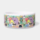 For stylish dogs, this dog bowl features a modern cartoon collage of dogs and a picture of your an English Bulldog and the dog’s name.