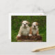 This fun canine post card features two adorable brown and white English Bulldog puppies standing on a wood log highlighted against a green woodsy background. The back of the card is blank for your message.