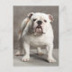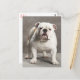 This fun canine postcard features a portrait of a chubby English Bulldog puppy dog highlighted against a creamy grey background.