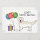 Cute birthday theme design featuring Destei's original cartoon illustration of a cute English cream coat colour Golden Retriever breed dog. The dog has a happy face expression with kind eyes and the dog's pink tongue is showing. Next to the dog there are colourful birthday balloons tied on a dog bone and a purple and yellow colour present box. The background has a playful pattern of colourful pastel confetti on a white background. Personalise the sample text areas with the details of your event.