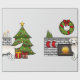 Destei's original cartoon illustration of a cute English cream colour Golden Retriever breed dog. The dog is placed in a festive living room that has a fireplace. The fireplace is on and it has two red stockings hanging on the side of it. On the top of the fireplace there is a green wreath that is decorated with a red bow and some yellow circles as lights. On top of the mantle there are three small triangle shaped trees also decorated with yellow circles as lights. The mantle also has two beige candles on it. Next to the fireplace there is a festive green Christmas tree with two presents under it. The Christmas tree is decorated with red and yellow round ornaments and a grey garland. On the top of the tree there is a yellow star.