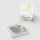The coasters are gorgeous, a quality feel and heavy weight. They look like a precious archeological find. A rustic stone juxtaposed with a modern floral black and white print. I like the way the print goes slightly imperfect on the cut stone edges giving them a kind-of natural beauty.