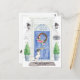 Announce your new address with our stylish announcement featuring a English Pointer, blue front door, welcome mat, slate sign, topiaries and a floral wreath set on a grey brick background.