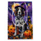 Embrace the Halloween spirit with this enchanting design featuring a cute dog in a witch hat surrounded by carved pumpkins. Perfect for adding a touch of spooky charm to your festive celebrations.