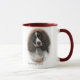 This is a white coffee mug featuring an original photograph of a beautiful, liver and white English Springer Spaniel.