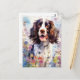 Colourful watercolor artwork of a English Springer Spaniel sitting in a field of spring flowers.