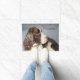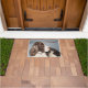 This is a doormat featuring an original photograph of a handsome liver and white English Springer spaniel with a blue/grey background