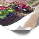 Poster of charming cottages with colourful facades line a quaint village street, surrounded by vibrant gardens overflowing with flowers. A blue sky completes the idyllic, peaceful scene.