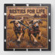 This lively square wall clock features a dimensional illustration of two brown dogs running toward the viewer through a grassy field. The entire design is rendered in rich brown and tan tones, strongly suggesting a deep carved relief or Engraved Wood Look. The dogs are highly detailed, showing texture in their fur, and have happy, open-mouthed expressions. They are surrounded by long, textured brown grass. The background shows a simple mountain ridge and stylized pine trees. The large, three-dimensional embossed text "BESTIES FOR LIFE" is carved across the top. The clock face features a simple clock face border with large, white, numbered tick marks (1 to 12) integrated into the outer frame. The artwork is surrounded by a thick, dark brown decorative border that resembles a black wood frame.