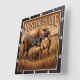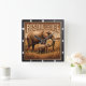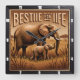 This detailed square wall clock features a dimensional illustration of a mother elephant and her baby walking through tall, dry grass. The design has a rich, monochromatic brown coloring with a deep wood-carved appearance, strongly suggesting an Engraved Wood Look. The elephants are rendered in textured brown tones, emphasizing the lines in their skin and the tusks of the mother. They are positioned against a pale brown sky with sparse brush or trees in the background. The large, three-dimensional embossed text "BESTIE FOR LIFE" is carved across the top. The clock face features a simple clock face border with large, white, numbered tick marks (1 to 12) integrated into the decorative frame. The artwork is surrounded by a dark, textured decorative border that resembles a black wood frame.