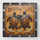 This striking square wall clock features a dimensional illustration of two sea turtles side-by-side against a deep orange background. The entire design is rendered in rich orange, deep brown, and black tones, strongly suggesting a carved relief or Engraved Wood Look. The turtles have highly detailed, textured shells in orange and brown, and are positioned between swirling layers of yellowish, foamy water. The large, three-dimensional embossed text "BESTIES FOR LIFE" is carved across the top. The clock face features a simple clock face border with large, white, numbered tick marks (1 to 12) integrated into the frame. The artwork is surrounded by a dark, textured decorative border that resembles a black wood frame.