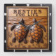This appealing square wall clock features a dimensional illustration of two sea turtles side-by-side. The entire design is rendered in rich brown and tan tones, strongly suggesting a carved relief or Engraved Wood Look. The turtles have highly detailed, textured shells in orange-brown and are positioned on a textured sandy ground. The ground area is decorated with stylized, star-shaped sand flowers or sparkles. The background features layers of waves and water texture in a monochromatic palette. The large, three-dimensional embossed text "BESTIES FOR LIFE" is carved across the top. The clock face features a simple clock face border with large, white, numbered tick marks (1 to 12). The artwork is surrounded by a dark, textured decorative border that resembles a black wood frame.