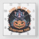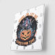 Enigmatic witch pondering atop a pumpkin at dusk square wall clock