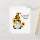 Adorable little gnome in a yellow and black buffalo plaid print has gathered some sunflowers. Text reads "Enjoy the Little Things".