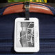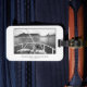 Luggage Tag with a black and white image of a fishing boat entering Cape Town harbour from Table Bay with the view of Table Mountain.