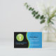 This green, blue and black business card features a light bulb with leaves in the centre. This design represents an Eco friendly business.