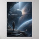 Experience the awe of deep space with this stunning sci-fi artwork featuring astronauts on a platform, a futuristic starship, and a breathtaking view of a swirling galaxy above a distant blue planet. Perfect for lovers of space art, sci-fi adventures, and cosmic exploration. Ideal for posters, tech cases, and gifts for space enthusiasts.
