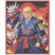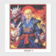 This captivating artwork depicts President Trump as a powerful samurai warrior standing confidently amidst a fiery backdrop. He is dressed in traditional blue and gold samurai armour, holds a katana and is surrounded by fierce, mythical demons. The intense red sky and flames add to the dramatic and fantastical atmosphere, making this image a striking representation of a heroic battle scene.