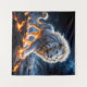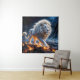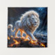 Discover a hyper-realistic digital artwork featuring an epic white lion made of flames, walking gracefully with fierce eyes locked on the viewer. The lion’s dense, textured fur is finely detailed, shimmering with tiny sparks under a dimly lit night sky. Magma falls around it, enhancing the magical and serene atmosphere. The lion stands on a rough, lava-like surface, with a colour palette dominated by shades of black and red, creating a chilly and enchanting ambiance.