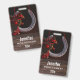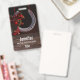A name tag with a photo featuring a hanging horseshoe adorned with a buffalo plaid ribbon and Christmas decorations.