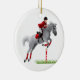 A beautiful, graceful jumper soaring over an oxer is featured here; poetry in motion.