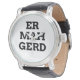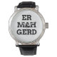 Dorky and fun typography text design watch featuring a word from the popular meme of Ermahgerd. Ermahgerd is a very obnoxious and lisped way to say "Oh my God!" Customise with your own text and background colour. Use an ermahgerd translator such as this one [http://ermahgerd.jmillerdesign.com/#!/translate] to make your personalised text even more silly!