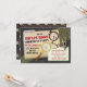 Escape Room Birthday Party Invitations. Features an worn folder, note card with info and clues, magnifying glass, lock and key, stop watch and finger print on a dark chalkboard background.