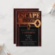 This custom party invitation features a mystery escape room theme. The background is a red coloured computer binary code pattern on black. A large copper key is printed across the centre with a keyhole lock below it.