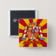 The national coat of arms of Espana (Spain), plus the country name, are designed in a perspective form. These images are in the center of a starburst background, which is made with the colors of the Spanish flag.