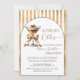 A elegant Coquette espresso martini birthday invitation. A fun design of a cocktail glass with a silk bow for your espresso martini themed birthday. A elegant arch shape with gold and white stripes behind gives a luxurious feel to the design,