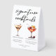 This sophisticated signature cocktails table tent sign features simple black typography above 2 of your favorite drinks and their ingredients for your coastal wedding bar. A chic Espresso Martini and Cherry French 75 drawing add a fun flair to your bar menu. Complete with the couple's names and date for their reception.