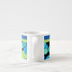 An Espresso Coffee Mug with a pattern of blue and green 'moons on a black background, from a handpainted paper collage by Judy Adamson.