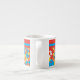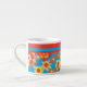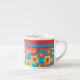 An Espresso Coffee Mug with a cheerful all-over pattern of red, orange and yellow flowers on a bright turquoise background, from a handpainted paper collage by Judy Adamson.