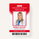 This personalised red ID badge includes an employee photo, name, title, hospital/company name, location, employee ID number, and barcode. Background features red and white. Back of badge features your logo and additional custom text fields for return information or other details. Perfect for medical or corporate facilities who need security identification.