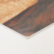 Una esterilla de color marrón claro con huellas de patas de perro, con una imagen de un perro observando