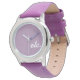 This simple, numberless watch features the abbreviation for "et cetera" (latin: and the rest) in white script text on a plain lavender background colour.  It's stylish, artsy, fashionable, etc.