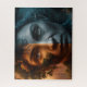 A captivating dark fantasy painting of a woman's face divided into two contrasting halves. The left side brims with youth and vitality in warm hues, while the right side reflects the wisdom of age in cooler tones. The expressive eyes, central to the artwork, highlight the journey through time, creating a mesmerising cinematic scene.