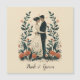 Captures the timeless moment of a couple's embrace on their wedding day, framed by an elegant floral spring motif, ideal for wedding cards and decor.