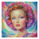 A breathtaking fantasy portrait of a woman adorned with a vivid flower crown and glowing pastel tones. Her luminous blue eyes and soft expression are complemented by a delicate butterfly and a swirling rainbow aura. This dreamlike illustration blends beauty, nature, and surreal elegance.