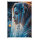 A close-up fantasy portrait of a calm, elegant young woman in profile facing left, illuminated by cinematic dual lighting—warm light glowing upward from below and cool cyan light cascading down from above. She wears a semi-transparent, glowing blue veil embroidered with delicate sparkling details. Fine glitter dust surrounds her, drifting through softly curling smoke, enhancing the mystical atmosphere. The dark, moody backdrop features glowing embers that add depth and a magical ambiance. Rendered in hyperrealistic detail with sharp facial textures, capturing a serene yet enchanting and powerful presence.