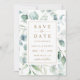 This wedding save the date invitation features painted watercolor eucalyptus and botanical green leaves with a gold rectangle frame.