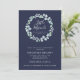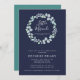 A modern Christian baby shower invitation perfect for anticipating a long awaited child. This design features the phrase "little miracle" in white hand lettered font, the Bible verse "for this child we prayed" 1st Samuel 1:27, encircled by a blue green watercolor eucalyptus wreath on a solid navy blue background. The reverse is in solid teal green.