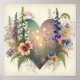 This captivating artwork showcases a symphony of flowers arranged in a heart shape, with a mesmerising backdrop that transitions from a soft, creamy palette to a dreamy celestial scene. The heart itself is composed of a diverse collection of flora, including towering spikes of delphiniums, delicate hibiscus, and a mix of wildflowers and ferns. This piece exudes a sense of tranquil beauty and would be a perfect addition to any room that needs a touch of nature's elegance.