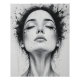 A centered frontal view of a woman with her eyes closed, rendered with soft gray washes that evoke calm and serenity. Sharp black splatter accents add contrast and depth, while ink pooling gently beneath her chin creates a grounded yet ethereal effect. The artwork balances softness and intensity to evoke a sense of peaceful introspection.