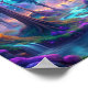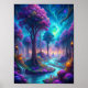 In this surreal painting, the scene unfolds with a dreamlike quality. Towering trees twist and turn in unusual shapes, their bark shimmering in vibrant hues of blue and purple. The leaves appear almost ethereal, glowing with an otherworldly light that contrasts sharply against the deep emerald background.